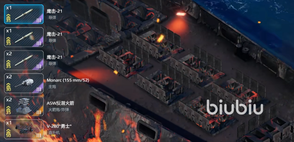 导弹配置是055输出的核心,一号与二号槽建议优先安装高爆发性与精准兼备的导弹系统,如RSM-56布拉瓦与鹰击-21。在当前版本中仍属一线导弹,不仅命中率高、飞行速度快,而且具有较强的穿透力,能有效压制敌方防御系统,适合打破敌阵或先手消耗。多轮交战中,也具备足够的续航能力。