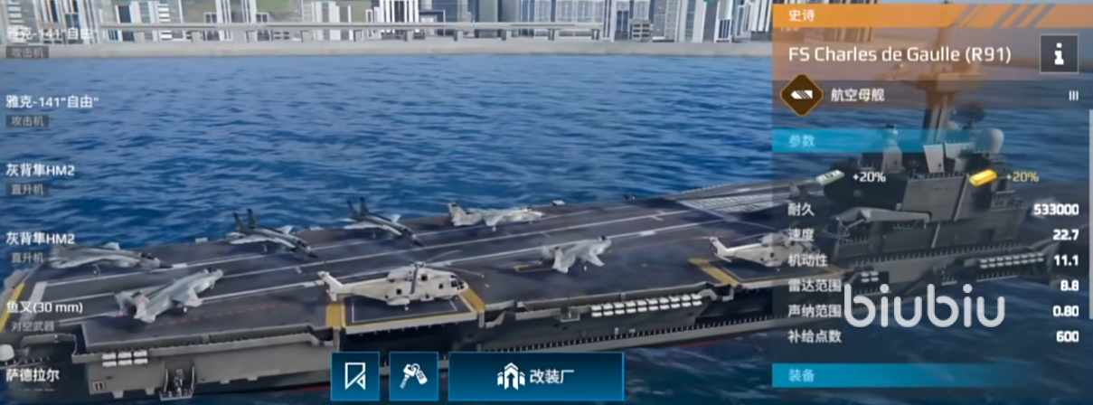 当前版本航母体系的最强轮椅之一,双攻击机配置和3+1直升机系统赋予了她极强的持续打击能力。配备苏39或“打击时刻”等强力攻击机后可以源源不断地向敌方施加空中压力,彻底撕裂对手的防空系统。相比传统突袭航母,她更偏向于持久性与战略压制,配合良好的反潜直升机还能实现反制敌方潜艇威胁,近战甚至具备驱逐级别的打击能力。航速与机动性表现优异,能灵活转场应对局势变化。不过,这一切前提是拥有足够的资源来获取。另外,其拦截能力有限,在点亮机制上存在劣势,如果没有强力机群作为支持,也难以发挥出应有的统治力。