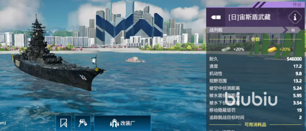 象征着火力与防空的巅峰,搭载3座三联装460mm主炮、两门副炮和双火箭炮系统,其单轮爆发伤害高达35万,几乎是以毁灭性的力量统治战场。进入其射程的敌舰,几轮精准打击下就会被轻松秒杀。武藏的防空系统也是顶尖配置,RIM-116C近防导弹、萨德垂发防空系统与40mm高频自动炮三位一体,能有效拦截多数空袭威胁。高火力的代价是极长的CD时间,主炮装填需16.1秒,副炮也需11.9秒,如果在架点输出中遇到敌人轮番上前换血,很容易陷入输出空窗期。同时其航速与转向性能极差,在面对机动型敌舰或大量导弹齐射时较为被动。因此,宙斯盾武藏更适合中远距离火力压制而不是正面突进。
