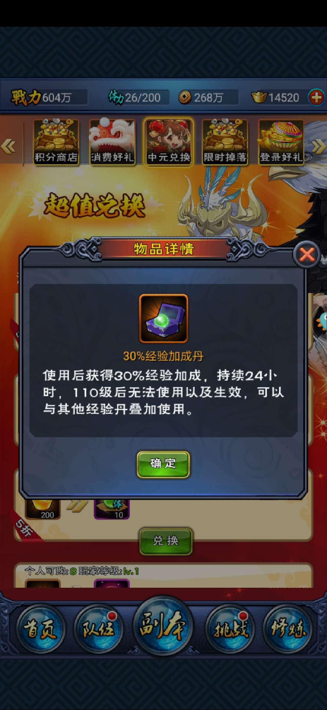 目前经验丹只能在系统的超值兑换界面处获得,每个玩家每天只能兑换一颗经验丹,售价100元宝。虽然价格很便宜,但是经验丹的作用却是非常大的。