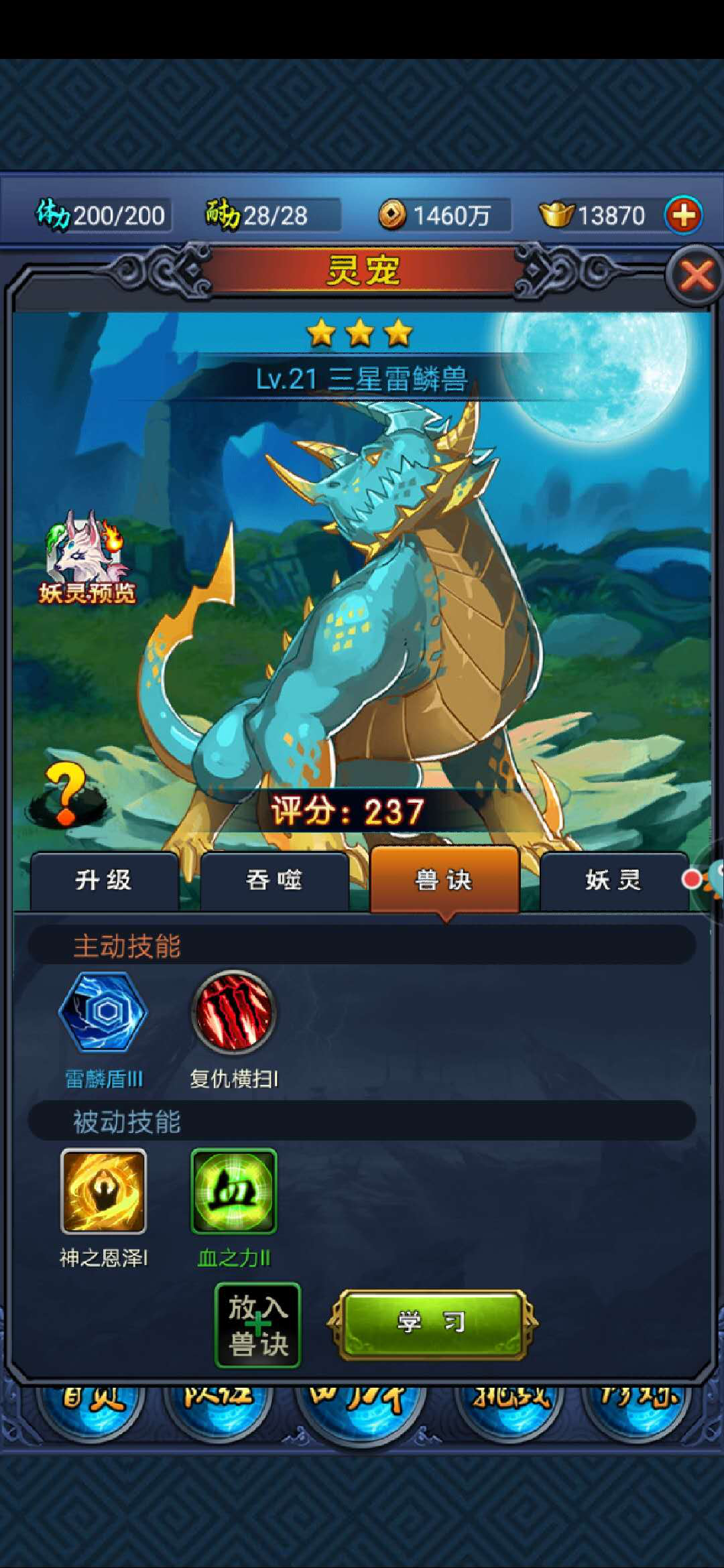 获得了橙色兽决技能后就可以为宠物学习了,技能又分为主动技能和被动技能两大类,三星宠物一般具有两个主动技能槽,两个被动技能槽。选中需要学习橙色技能的宠物,点击培养选项,在其中选择兽决功能就可以开始学习兽决了。