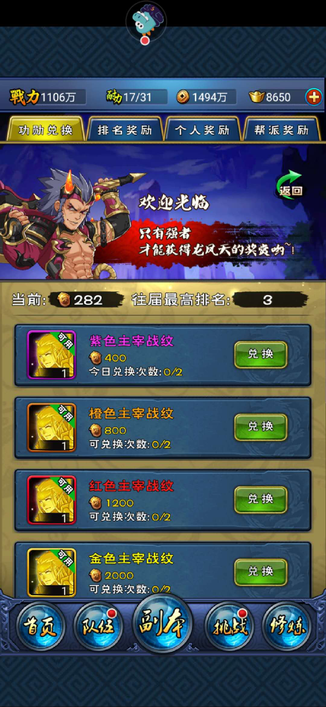 点击挑战功能,在其中找到龙凤天争霸选项,进去之后就可以选择合适的对手进行战斗了,每次战斗胜利后都可以获得一定的龙凤天积分和龙凤天点数,每天按照积分排名也会奖励大量的龙凤天点数。在兑换商店里,使用龙凤天点数可以兑换到金色主宰战纹,每个金色战纹售价2000点数,每天可以兑换两次。