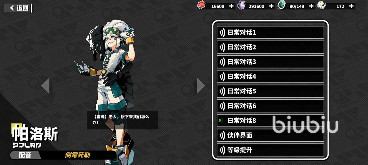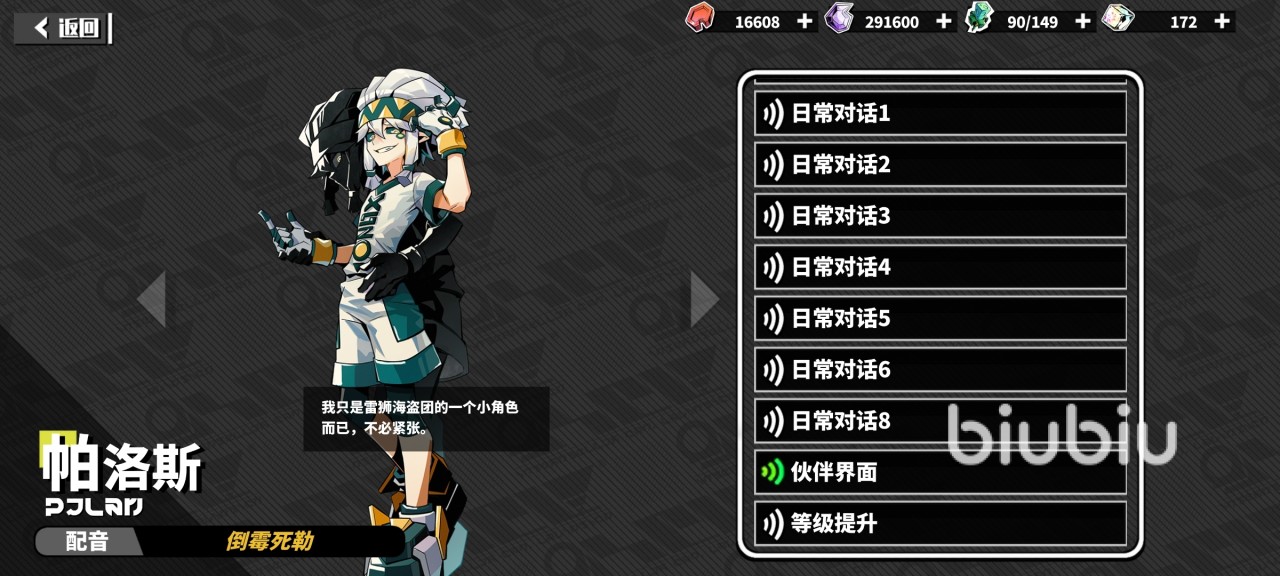 首先可以看到这个角色的语音对话,这个是游戏当中正在up的雷狮的小弟,也就是他的海盗团的重要成员,虽然在游戏的搭配上没有多少搭配但是语音当中是有很大的联系的,获取雷狮之后解锁专属的语音互动,在这个界面就能听到。