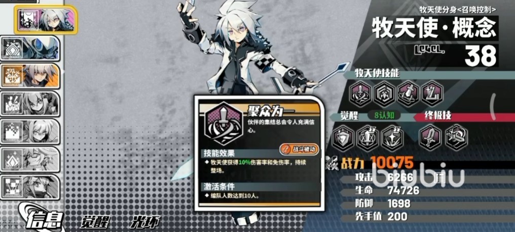 游戏中大家初始携带的是名为“概念”的牧天使,根据不同的激活条件,会有不一样的被动效果,例如有5张橙卡可以激活强者特权,让牧天使和角色都获得15%的攻击率、防御率、最大生命值提升。除了这些基础被动技能外,还有觉醒技能,这个一般是区别开不同天使定位的关键,例如概念是提供增伤、能量、分身。终结技则是单体和群体伤害,属于中规中矩的输出型天使。