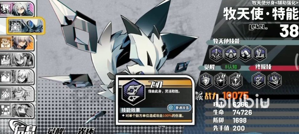 随着剧情推进以及信物的收集,玩家会解锁“特能”,该天使拥有个体强化加降费的技能,觉醒后还可以增加进场能量以及对敌方首领的伤害,终结技高额单体伤害以及对首领特攻。毫无疑问这是一个专门用来挑战强力boss时需要用到的天使。
