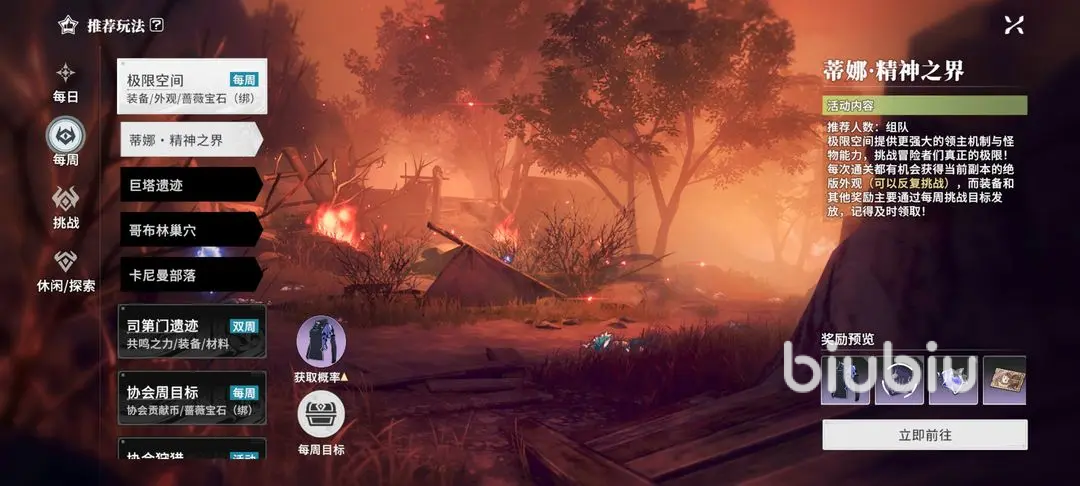 1、每周极限空间。推荐组队去玩,这里能提供更加强大的领主机制和怪物能力,这里会挑战大家真正的极限,每一次通关都有概率获得当前副本的绝版外观,能反复去挑战,装备和奖励是通过每周挑战目标发放。