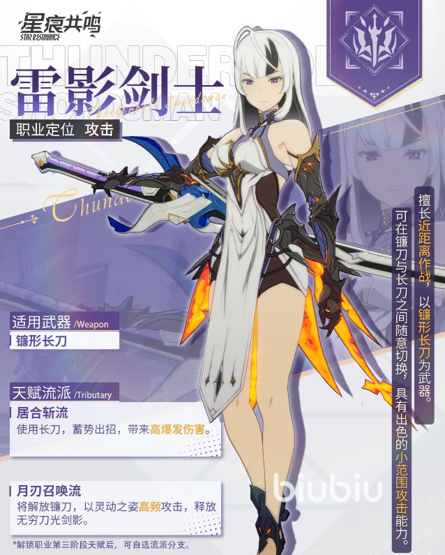 雷影剑士属于攻击型职业,攻击十分灵活多变,能在中短距离的作战中打出不错伤害,普攻会以长刀形态进行最多4段斩击,每段形成物理伤害,特殊攻击会在蓄力后对前方进行一次迅猛的斩击,消耗当前拥有的所有雷之印形成物伤,每成功消耗一个雷之印,就会让伤害增加30%,“超高出力”会解放武器能量,每次进行攻击解开镰刀的形态,形成更高的输出值,并获得1个雷之印;