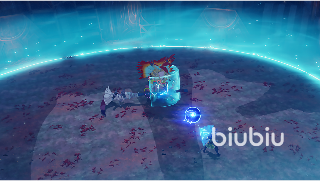 这是队伍整体都向场边走,可以优先击杀剑盾哥林布,最好是让奶妈去捡到第一个掉落的盾,捡到的盾就能起到防护作用,此时可以等待这段时间机制结束,也是为了后续机制做准备。后面会有弹射能量球,没有达成条件,BOSS会全屏输出一次,达成条件,BOSS就会进入虚弱状态。