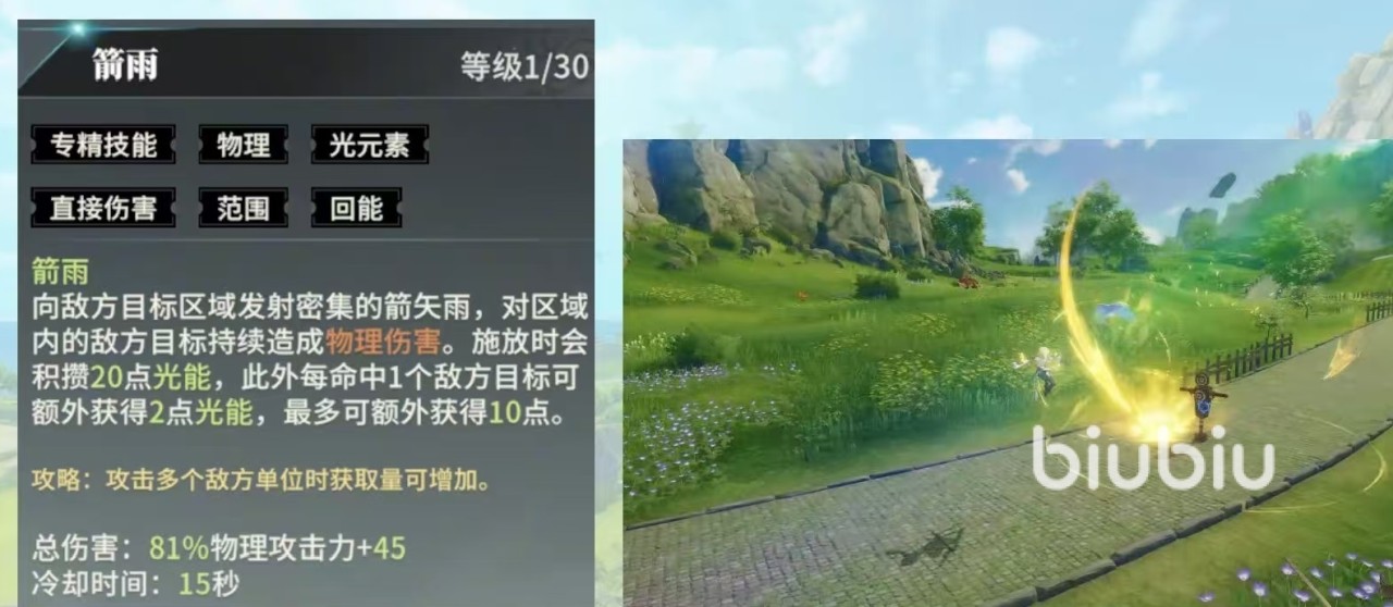 天赋方面选择狼之契约、灵能激流和三重之矢等。狼之契约可以驯养一只野狼跟随战斗,狼可以对目标进行普通攻击,也可以协同攻击,普通攻击造成40%攻击伤害,协同攻击造成250%伤害。灵能激流效果是每释放10次特殊攻击,下一次箭羽,得到的光能可提升100%。三重之矢是普攻有5%固定几率,使特殊攻击立即进行一次充能。