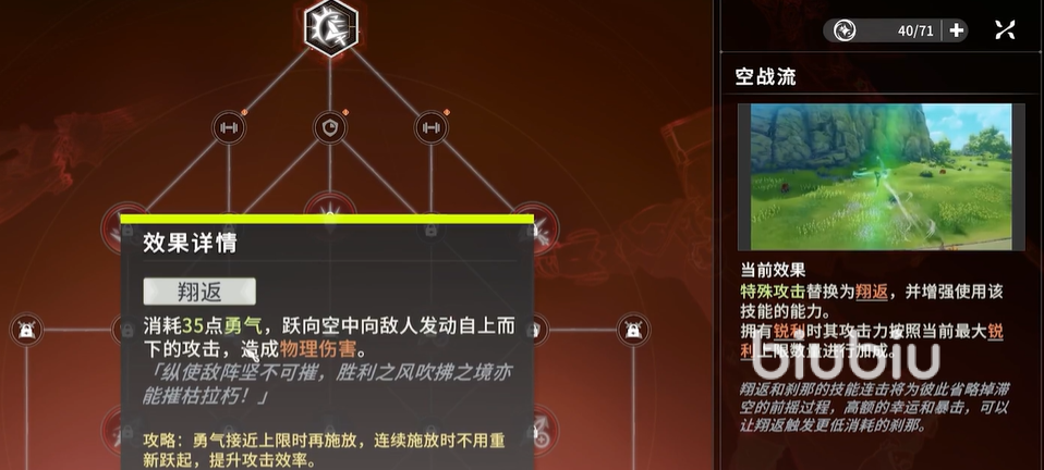 首先就是空战骑士的技能加点,首先需要选择空战流派,这个流派的效果就是特殊攻击直接换成翔返,这样玩家们就能顺利进入空中发动后续的连击,接着就是其技能的分支几个技能需要重点选择,第一个是追击身法,该技能可以优化空中的连招间隙,其手感方面会更好。