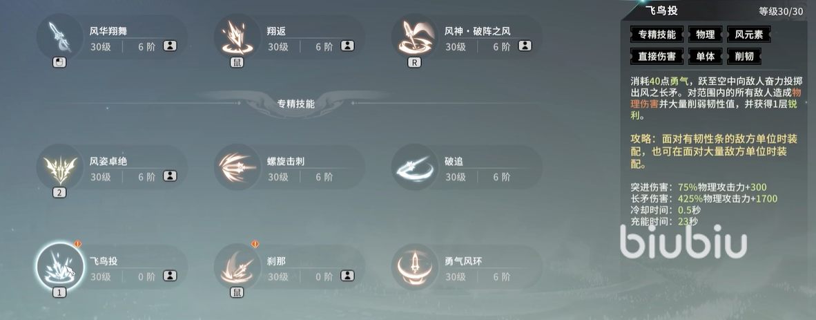 之后就是其他技能的加点,优先选择飞鸟投,刹那和锐利冲击,这三个技能是可以跟翔返进行连段的,基本上 一套下来很容易秒杀小boss以及怪物,而且整套技能下来可以展现出空战骑士的独特性。