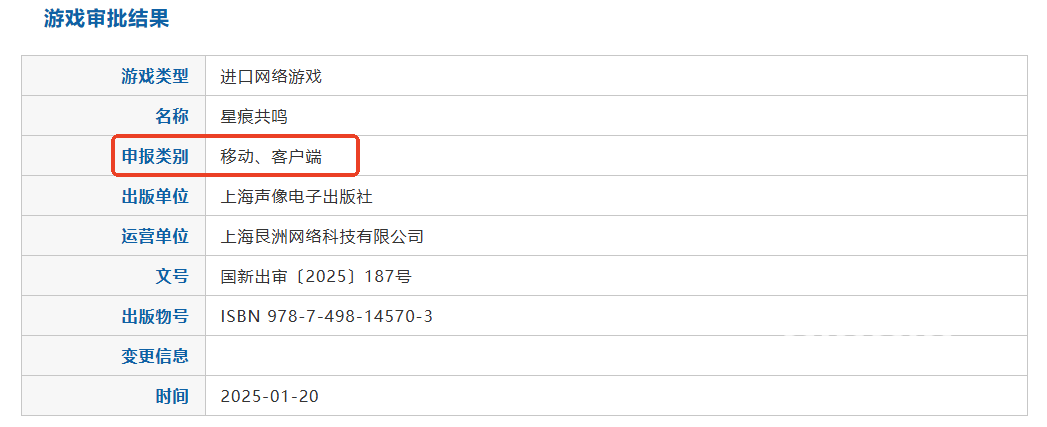 星痕共鸣既是手游也是端游,它是多端互通的游戏,这点从游戏的过审版号信息中也是可以得到证实的,申报类别中有移动端也有客户端,这里的客户端其实就是指PC客户端。