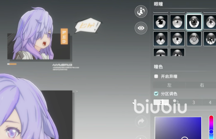 然后就是五官的改变,五官方面的眼睛可以直接从选项里找出,这种眼睛是属于比较大且方圆类型的,可以直接选择中间的那个眼睛,然后就是眼睛的颜色,也可以直接选择紫色,这样跟发型是比较搭配的,眉毛的话直接选择最后一个选项,这样五官的塑造就大致完成了。