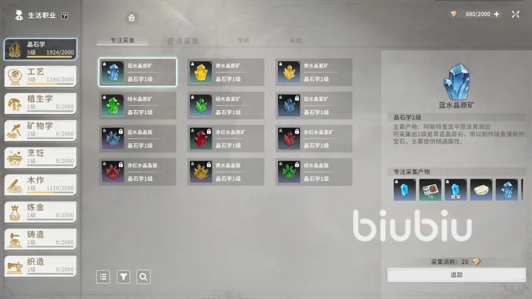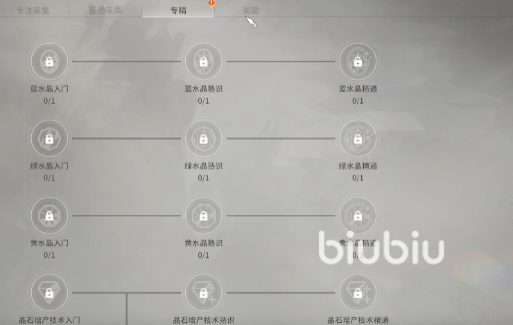 分为专注采集,普通采集,专精,奖励4个板块,其他也是同理。先看普通采集,当该职业达到了对应的等级,就可以对4种原矿石,外加6种材料进行采集,通过“追踪”的功能,就能找到对应材料在地图上所处的位置,传送到附近点位,就可进行采集,主要可获取三种奖励,一是采集材料,二是少量职业经验,可用于升级对应职业,后续能解锁更多材料,三则是有概率获得“星元尘晶”,主要用于制作金色装备。