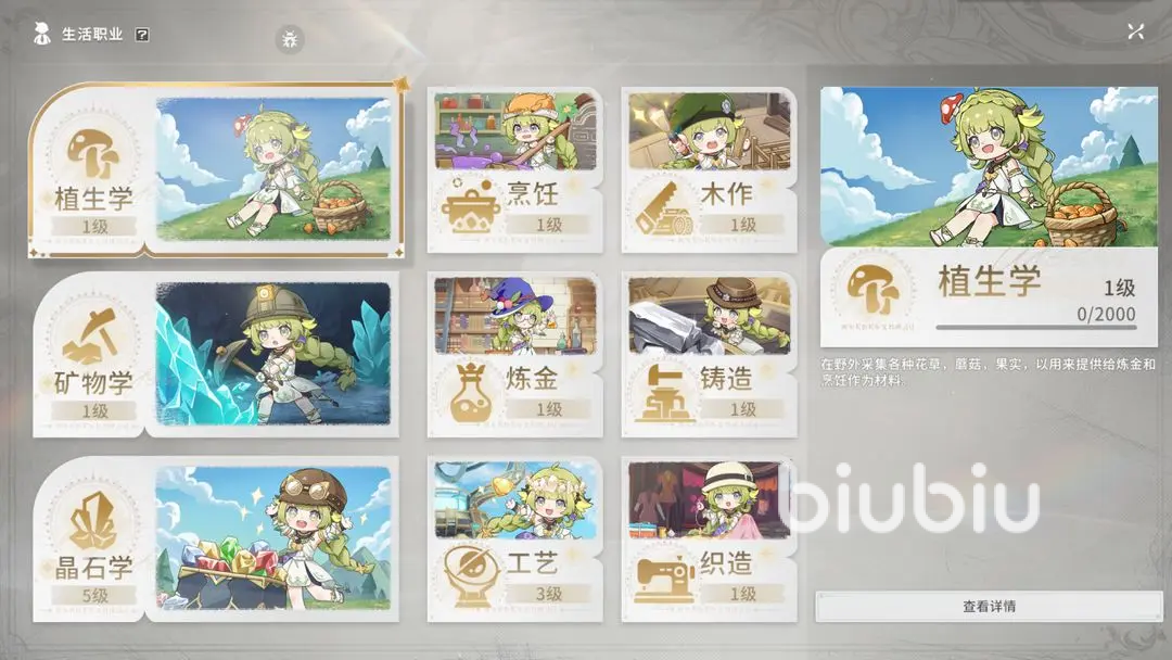 生活职业总共有9个,主要分为“晶石学”,“植物学”,“矿物学”3个基础职业,基础职业以采集原材料为主,“工艺”,“烹饪”,“木作”,“炼金”,“铸造”,“织造”6个进阶职业,进阶主要是以材料的加工制作为主,每一个职业都有各自独立的等级,基础和进阶之间存在一定的关联性。