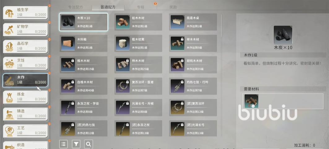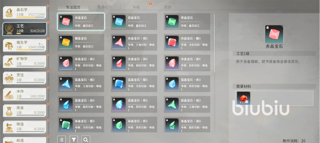 以工艺学举例,进阶也同样分为上述四个不同的模块,专精和奖励与基础的是类似的,这里重点讲一下专注配方和普通配方,专注配方主要以一些宝石的制作为主,制作这些宝石需要的原材料需要通过前面介绍的基础职业获得,也就是晶石学中的专注采集,如果玩家们并没有过多时间自己去采集,也可直接在交易中心购买其他玩家出售的原材料。