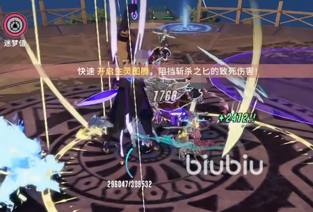 这个时候他会进行一次大范围的红圈斩击,t位需要拉好面向以免斩击攻击到队伍其它的角色,之后还会有蓝色虚空门出现,出现之后会释放激光到图腾位置,需要派一位玩家去阻断激光,之后完成后刚好可以将其打到破防状态,需要在该状态下集火进行输出,能打多少血量就打多少,之后再补点伤害就能击杀他了。