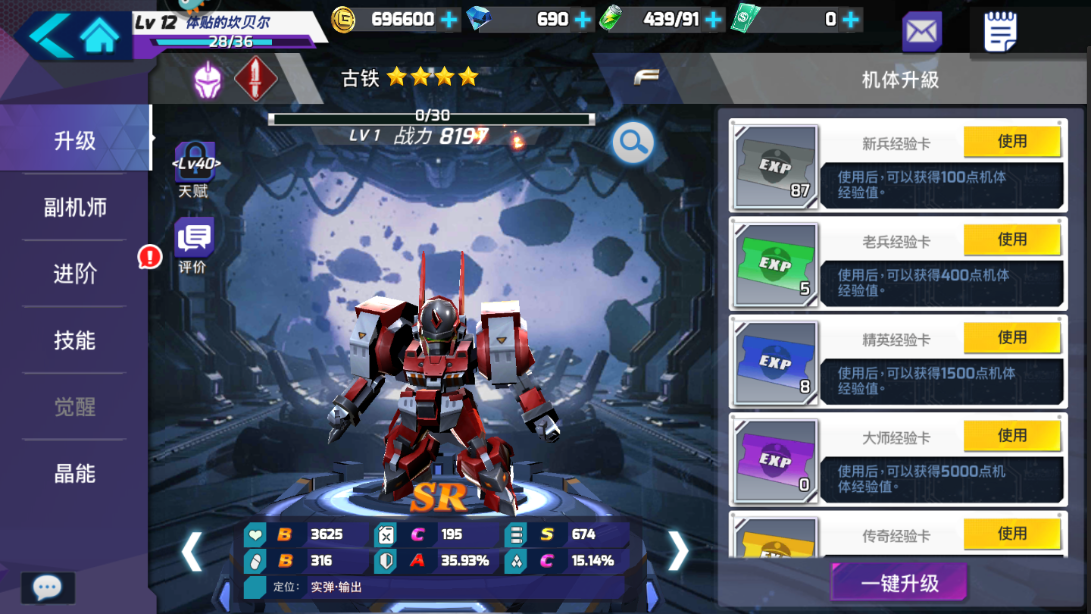 战舰是带着所有机甲的母体,战舰等级和指挥官等级挂钩,在有了比较好的战舰之后可以通过战斗来给战舰提高等级。建筑等级的提升也受制于指挥官等级,中期的时候会开指挥中心研究中心兵营等等建筑,用于升级科技制造防御体系,各个建筑的等级都有一定的作用也需要花费很多资源。机甲各自都有自己的等级,通过战斗来获得经验提升等级,等级和战斗力直接挂钩,因此多多提高机甲的战斗力可以更好的挑战各种副本。