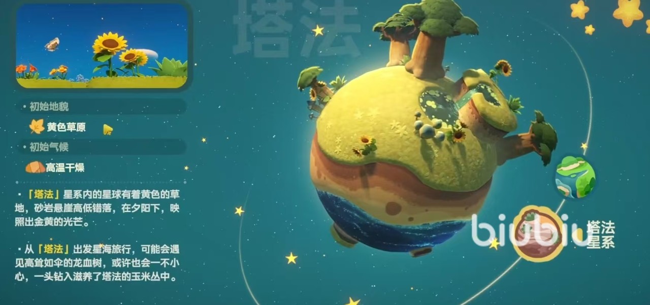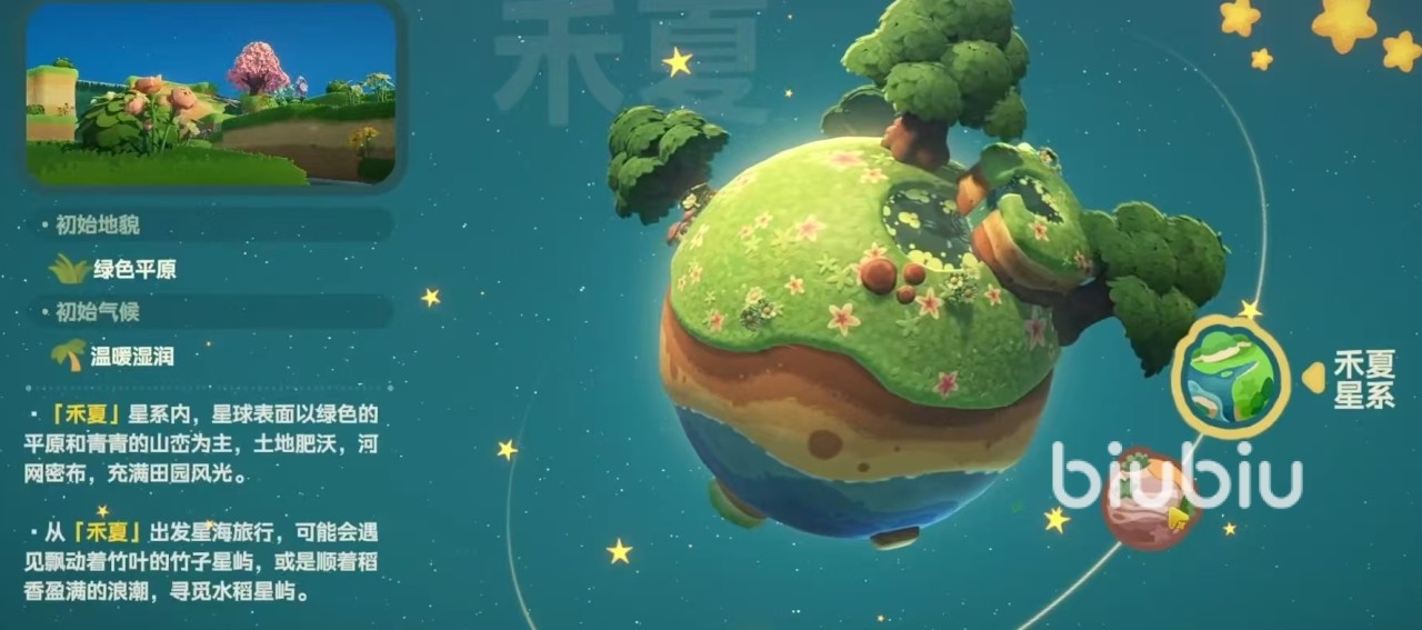 目前游戏初始一共有两个星系,分别是禾夏星系和塔法星系。其中禾夏星系的初始地貌为绿色平原,一望无际,绿油油的生机盎然,初始气候也是温暖湿润,非常适合进行种植。在河夏星系内,星球表面是以绿色的平原和青青的山峦为主,土地非常肥沃,密布河网,充满田园风光。塔法星系的初始地貌为黄色草原,初始气候干燥高温,有点类似于地球上的非洲气候。在塔法星系内的星球上,有着黄色的草地,砂岩悬崖高低错落,在夕阳下可以映照出金黄色的光芒,