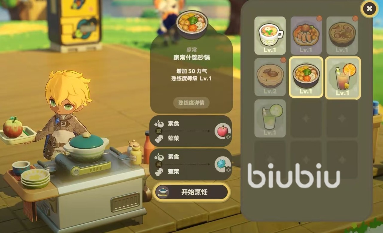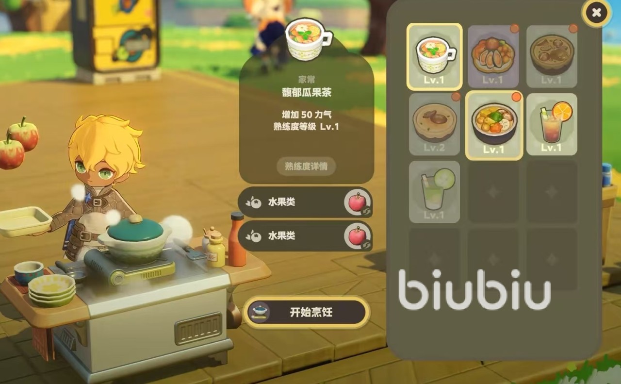 上面所说的都是属于主菜类型的烹饪,还有一些是属于茶类或者是饮料类。第16个和煦花果茶,需要两份鲜花或者是水果类,消耗50点体力。第17个馥郁果瓜茶,需要两份水果,消耗50点体力。第18个是鱼汤,需要两份鱼类,50点体力。第19个绵绵麦奶,需要两份小麦,消耗50点体力。第20个禾夏麦香曲,需要小麦和稻米,消耗50点体力。第21个禾夏米酿,需要两份稻米,消耗50点体力。第22个甜甜米果酿,需要水果加稻米,消耗50点体力。