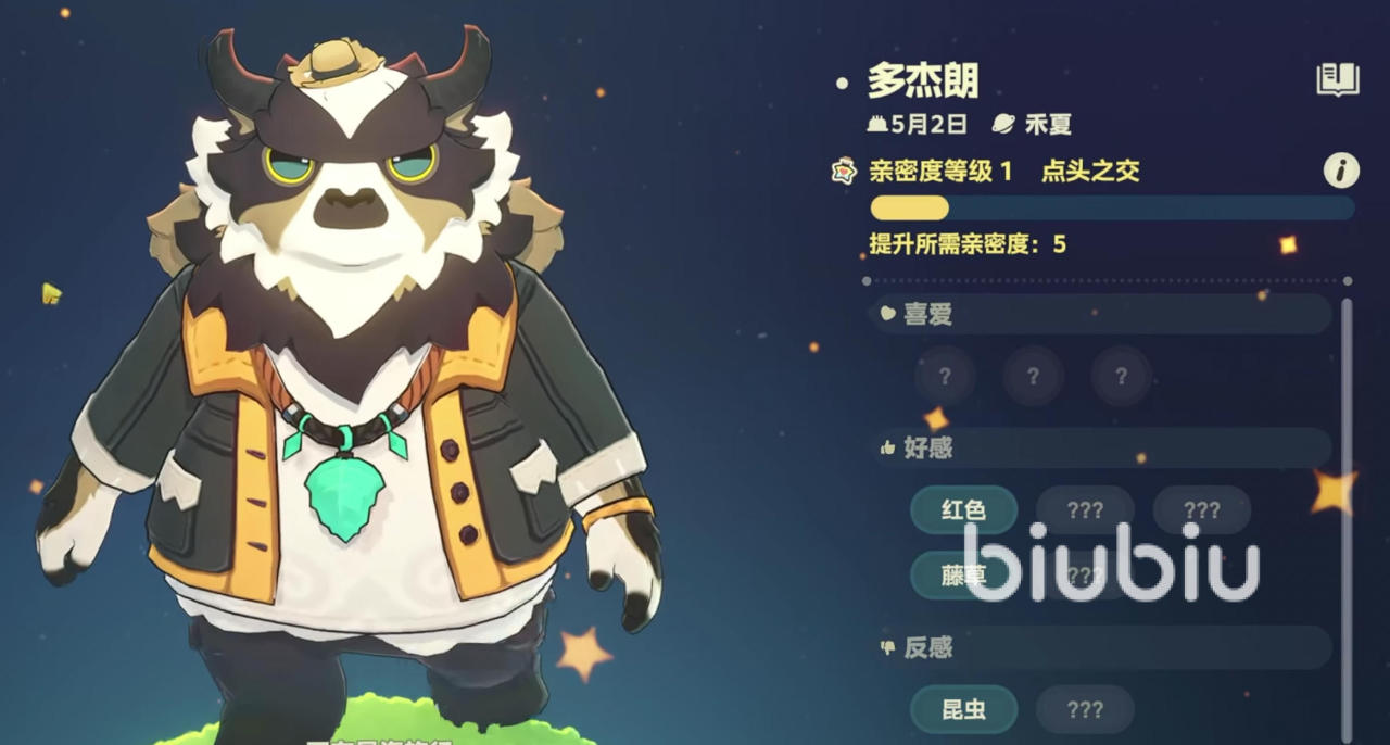想要把多杰朗邀请来自己的星球居住的话,还要进一步提升和他的好感度,毕竟大家在日常生活中也不会随便去一个陌生人家里住吧,这还是非常合理的游戏设定。我们一开始可以随便给他送个价值不高的礼物,先把好感度升到1星,这样就能在图鉴中看到他好感和反感的东西。