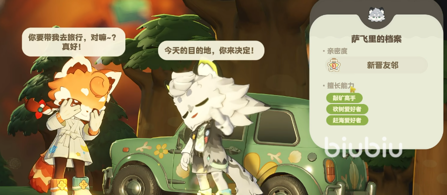 如果玩家在初始星球时选择的是夏禾星球的话,后续想要结识萨飞里的话,只能通过星海旅行了,这个玩法是让玩家前往不同的星屿进行探索,在探索时就有机会解锁不同的npc,小编建议玩家们可以结识后通过赠送一些小礼物先建立一点等级的好高度,以便后续探索时可以携带他们一起探索。萨飞里在探索上主要有挖矿、钓鱼、砍树的加成。