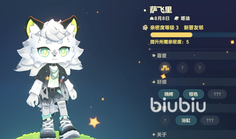 萨飞里是塔法星球上的原著居民,他出生于8月8日,是典型的狮子座性格。在喜好上他喜欢烧烤、棕色等,反感浴缸。玩家可以根据他这些性格喜好选择他喜好的礼物,选对了礼物也加速好感度的提升。