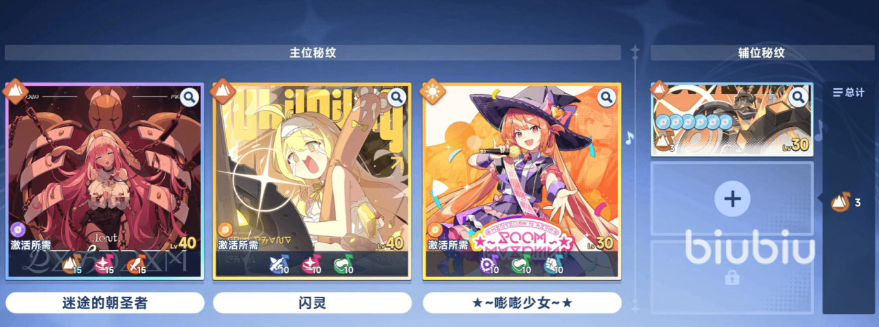 知道以上的这些条件搭配就很简单了,我们可以先看队伍中角色,如果是2个地属性加1个光属性,那主位肯定要放置好2个地属性秘纹和1个光属性秘纹,尽量用手上稀有度最高或者和角色需求属性比较适配的,放置好主位后,根据主位需要的音符类型,来放置辅位激活更多协奏技即可。
