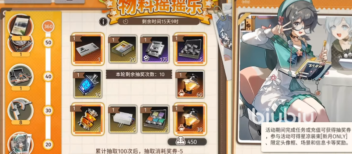 定位上为攻也就是输出,指令为新的机制元效果为主动选择技能进行增强,这就是周年庆角色的大致情况了,可以看出还是比较强的是值得去抽的,之后是一个叫做物料摇摇乐的活动,这活动中玩家需要消耗抽奖卷去抽奖。