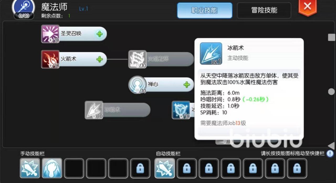 除了属性点的分配,各位还需要针对技能进行加点。刚完成转职的玩家,优先去考虑提升冰箭术的等级,此技能会让法师拥有稳定的范围伤害能力,并且并不会消耗太多的魔法值。后期可以考虑与火箭术一起相结合使用,并且配合上圣灵召唤还可以获得很好的辅助战力效果。
