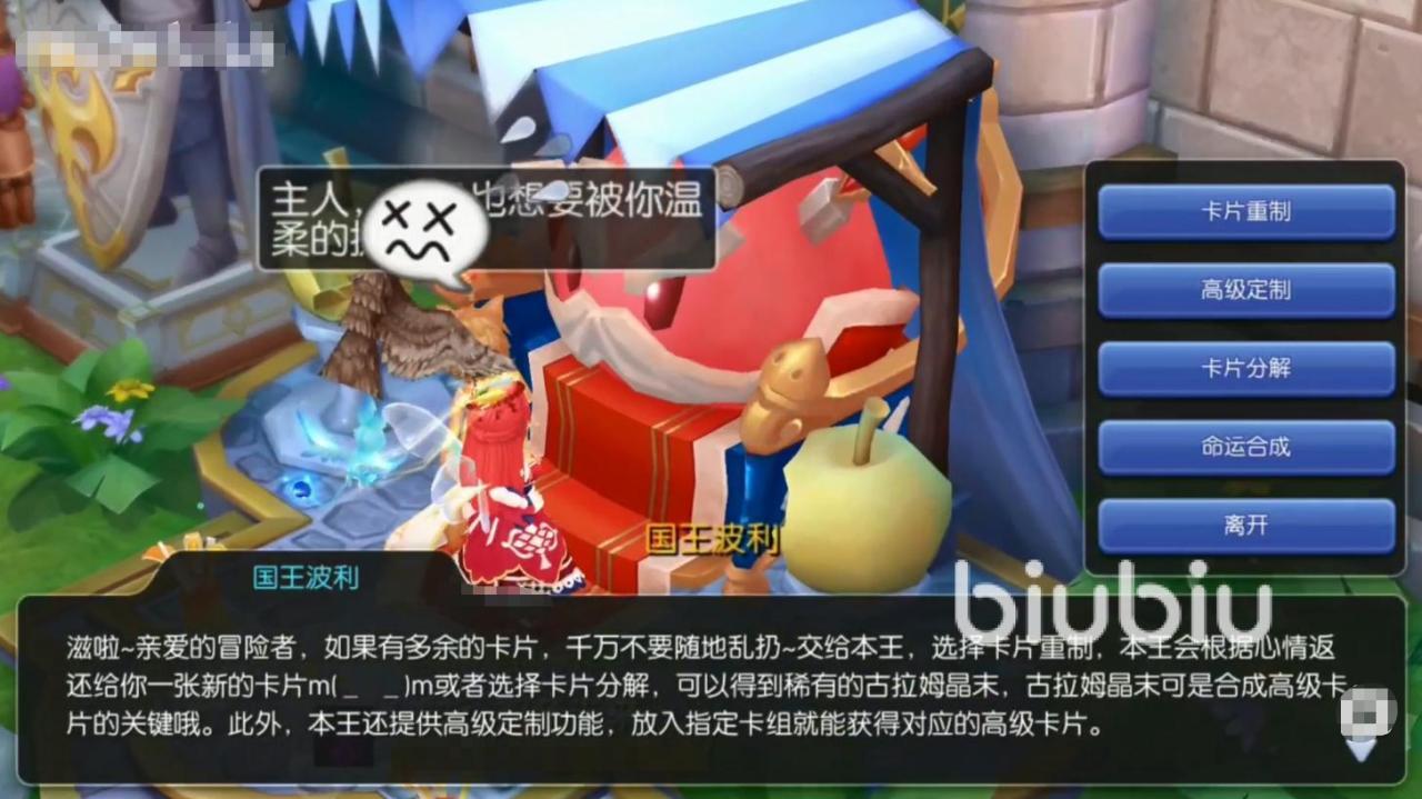 想要得到卡片的各位,首先就需要在游戏当中找到国王波利,目前该角色会直接在王城当中,大家传送到目的地即可。随后与之进行对话,大家就可以看到命运合成的选项,而此功能就是玩家们得到各类卡片的核心获取方式。