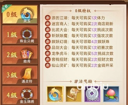 最基础的0级就已经有不少特权了,例如每天能买1次体力,买2次商店刷新、1次挑战次数、1次强攻次数、4次瞑妖珠的领取次数、2次招财次数、2次金镐开采机会。