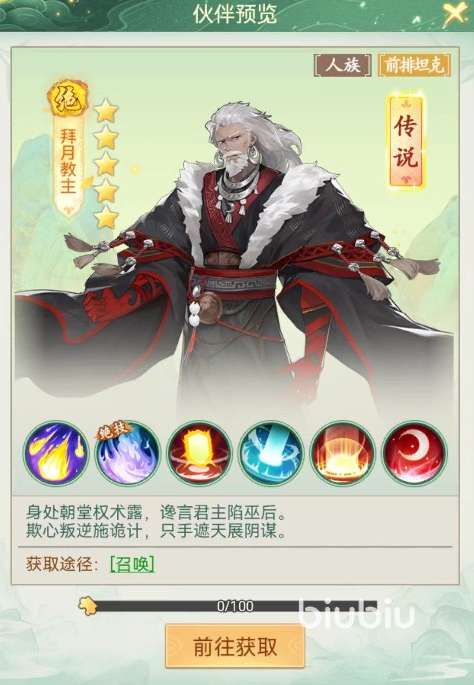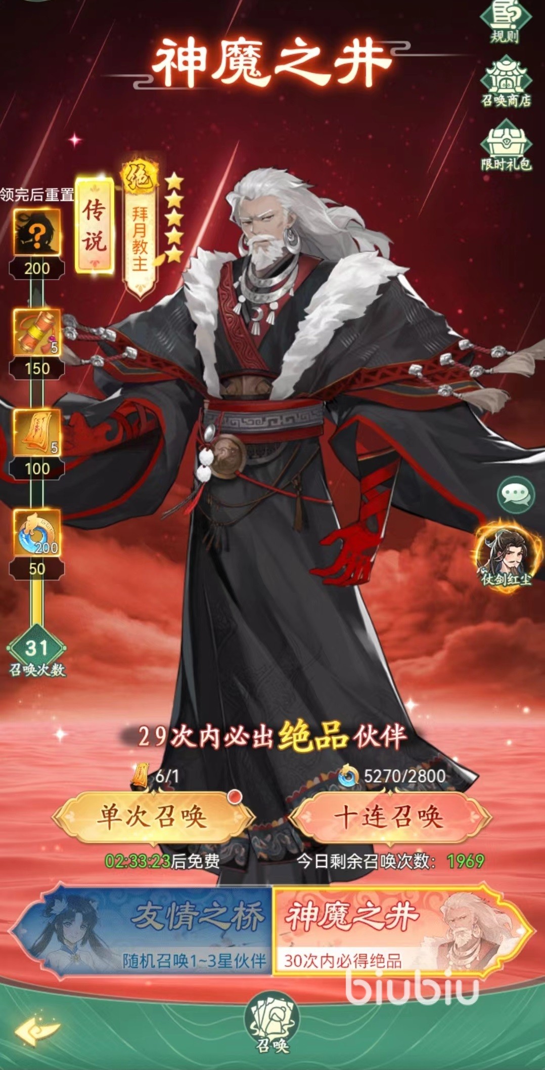 目前神魔之井中拜月教主就是最佳选择,也是众多玩家的终极目标。拜月教主不仅是传说角色,更是不可缺少的前排坦克。绝技万象真火,在造成极高单体伤害的同时,还能大幅提高自身减伤。还有永久物理防御和仙术防御的被动护体,首次出手前给己方全体增加护盾,抵消一定伤害的先手技能,这样不仅自己非常硬,也能够保护团队。