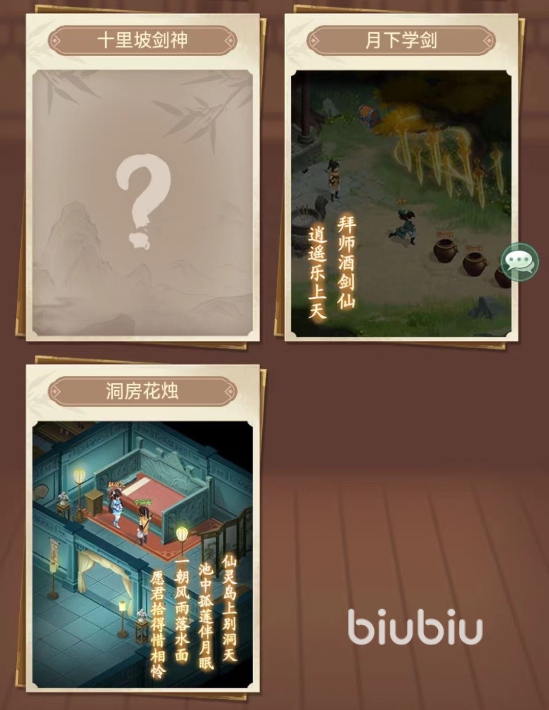 仙剑中的经典环节都在这里有所收录,例如李逍遥和赵灵儿在仙灵岛上的洞房花烛,李逍遥和酒剑仙学见识的月下学剑,接下来还有十里坡剑神,比武招亲,魂断塔底,塔中相会等,相信这些名字,大家在看过之后就会涌现出一段段回忆。再加上进入前尘夜梦之后,整个游戏的背景音乐也会出现变化,抒情的音乐搭配上这些熟悉的名字和诗句,将大家的思绪再一次拉到当年的单机时代。