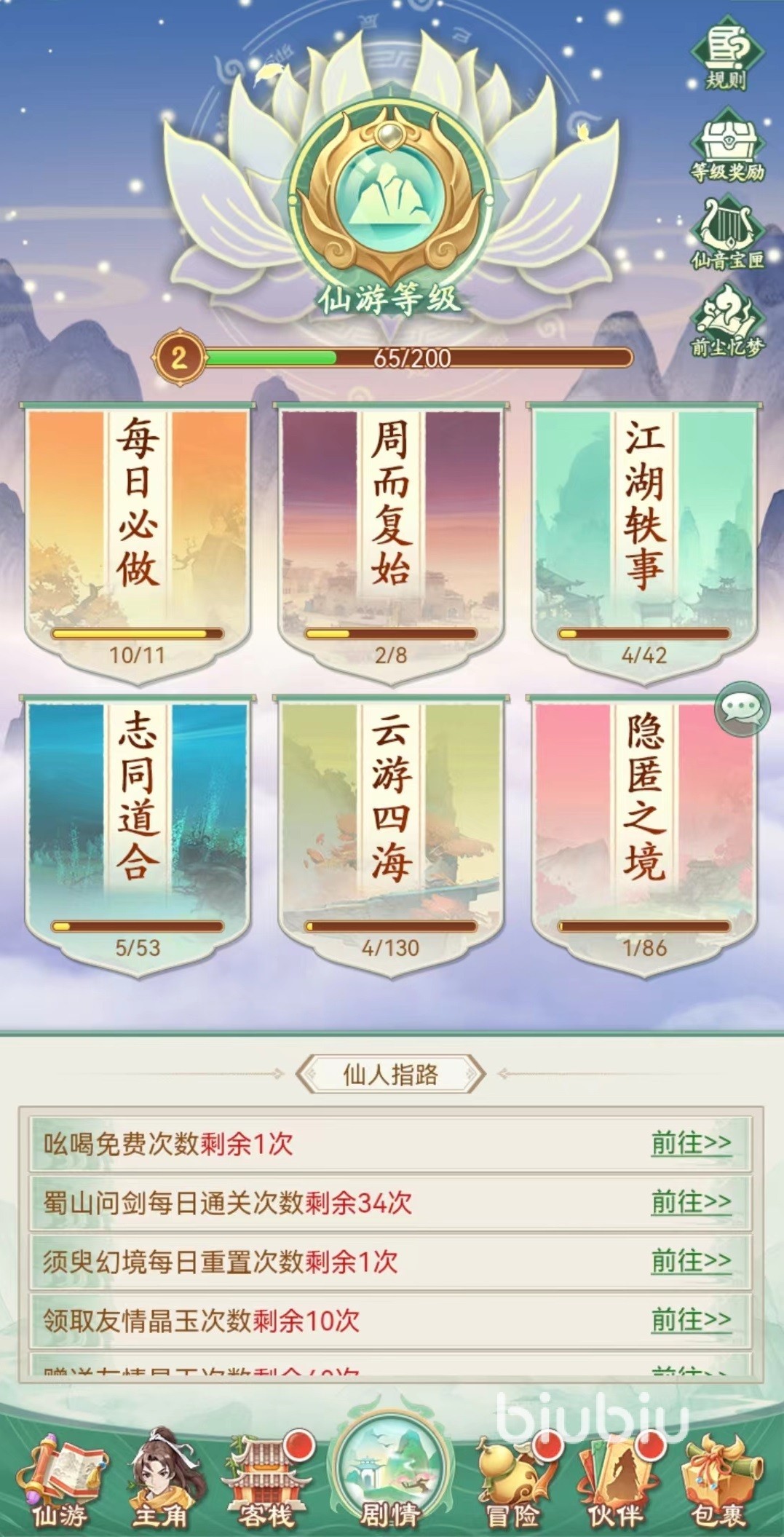 在主页面的下方找到仙游,从中就可以看到前尘忆梦活动,该项活动主要是玩家所经历的所有剧情,都会在这里保存下来,另外还有剧情回顾,也属于这一活动中的一项。所有可分享的剧情、彩蛋、片段都会收藏在这里,每次成功分享后才能获得奖励。