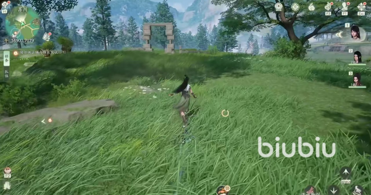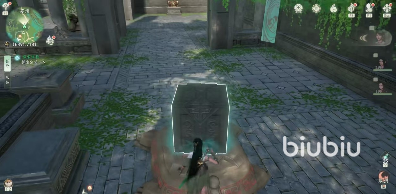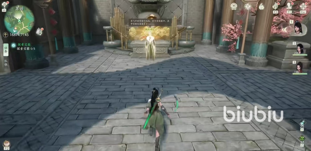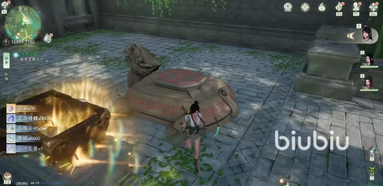 水月洞天的位置是在苏州城外的河边,可以看到很明显的有一个石头门,进入门中,就可以传送到水月洞天,然后开启解谜了。首先进入水月洞天之后先右转,转两次拿到石头,放到乌龟上,就可以将门打开,进门之后在树下开启里面的第1个宝箱,然后再站到旁边的石像上,将上方的石头,用游戏里学会的牵引能力,直接拉过来放到石像上,进去之后打开第2个箱子。
