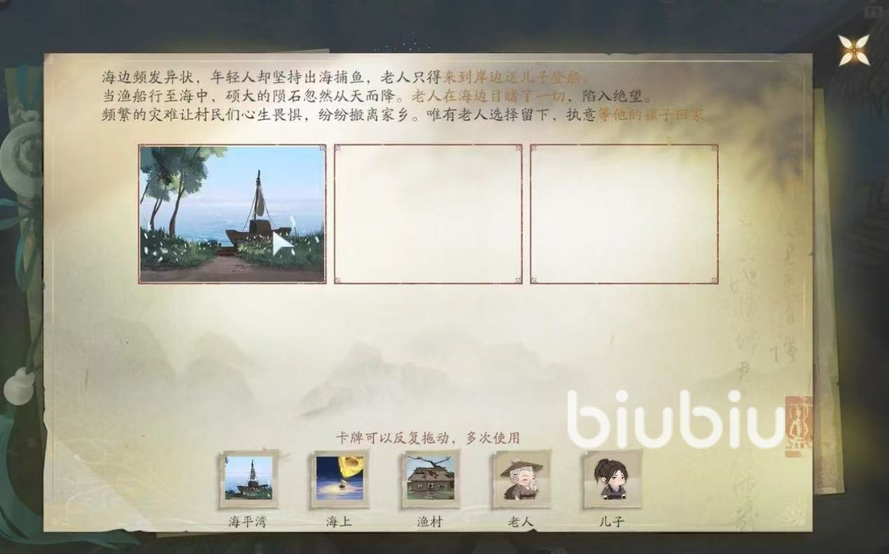 然后来到第4关也就是最终激活改魂剑,这里需要玩一个贴纸游戏,第1张海平湾加老人加儿子,第2张是海上加老人,第3张是渔村加老人。按照这样的顺序就可以通关了,卡牌是可以反复拖拽的,也可以多次使用。