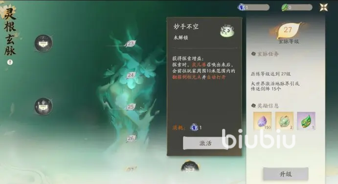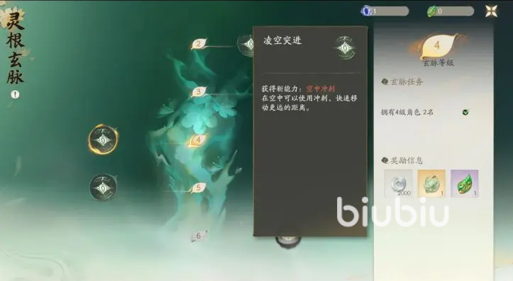 天赋系统也被称为灵根玄脉,玩家通过任务提升其等级,同时获得战斗增益、灵元等奖励。灵根玄脉共有六十等级,玩家每晋升一级天赋,直接获得一个增益效果,比如化灵、御物、凌空突进等。
