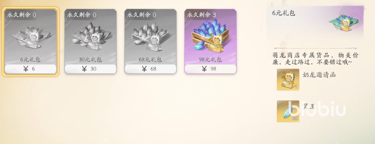 然后商店中一共有四种礼包,分别为6元、30、68元以及98元。分别限购一每种礼包都包含着一张邀请券。所以想要100%获得他的话就要全部入手,虽然说花销较大,但是也包含着其他值钱的东西,例如装备或者皮肤。
