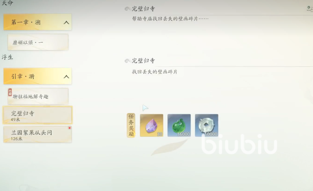 最后一个壁画碎片玩家需要向凉亭中找到一个长衣服的npc,在与他对话之后玩家就可以找到第三个壁画碎片。当玩家凑齐所有的碎片之后需要通过御物技能来将壁画碎片按照指定的顺序安放,在玩家完成这个任务之后就能够壁画的贴图,并且还能够获得非常多的金钱奖励。