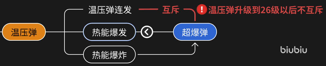 温压弹的技能进阶解锁条件只要掌握正确在实战中可以有更好的效果。由于温压弹只能够在触碰单位的第一个范围中心进行爆炸,所以及时的使用子弹分裂这个技能来清理小怪非常重要,将本来技能冷却比较慢的每一发温压弹输出打满;在技能的进阶上小编个人建议优先选择热能爆炸或者是热能爆发,分别能够增加爆炸范围和伤害,其次再是考虑它的冲击击退效果。