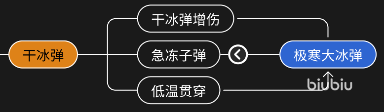 最基础的连发、齐射都没有进阶高级技能;散射小冰弹可以进阶成增伤和急冻小冰弹,效果为小冰蛋的伤害可以增加,而且也可以叠加冻伤效果;另外一个急冻寒冰可以冻结怪物2秒,进阶为冰冻侵袭,也可以选择急冻小冰弹;急冻寒冰、干冰弹增伤、低温贯穿这三个技能词条可以强化升级为高级技能极寒大冰弹;低温贯穿后置解锁技能为凝双重冰。至于冰暴发生器是选择干冰弹之后概率比较低的一个高级技能,进阶技能为冰系缩减。