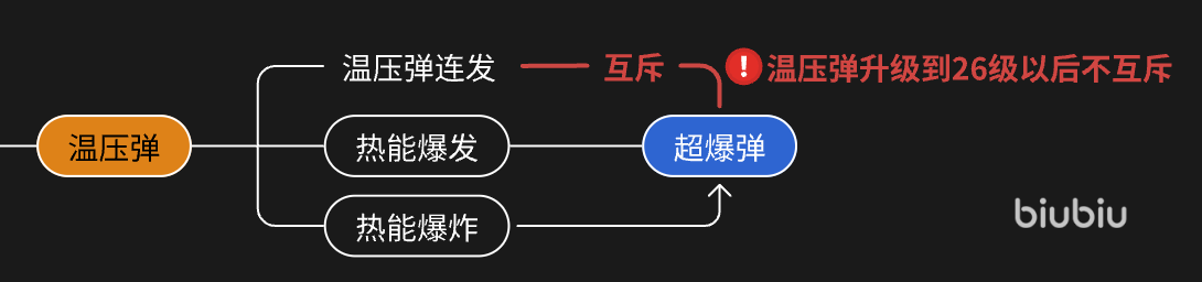 温压弹技能词条最基础的其实就是温压冲击,解锁之后可以激活富燃料填充;热能爆炸后面一共可以分裂成4个,分别为爆炸火花、热能引燃以及超爆弹还有富燃料填充,热能引燃后就会有高级技能热能焚身,激活之后对敌人造成伤害的同时还能对对方最大生命值造成额外的损伤;另外一个就是热能爆发,进阶也是超爆弹;最推荐大家使用的还是温压弹连发,前期不仅刷怪效率高,后期还能额外释放两枚;但要注意温压弹连发和超爆弹是互斥的,想走温压弹连发流派就没办法走超爆弹。