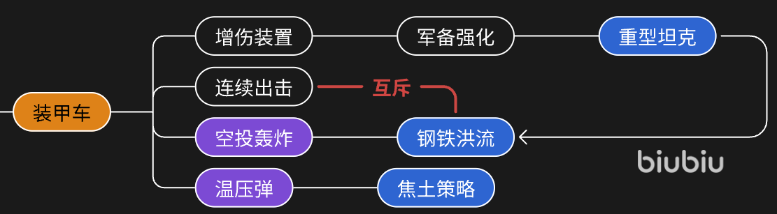 装甲车是玩家公认的前期推图技能,致残碾压、致命冲撞、势不可挡、极速冲锋这4个普通技能都是没有进阶效果的;装甲车配合空投轰炸可以激活钢铁洪流,是一个全屏对敌人进行碾压打击的神技;装甲车搭配温压弹可以激活焦土策略,效果为装甲车从屏幕下方向前方移动的时候前方会着火引燃怪物持续造成伤害;注意装甲车后的进阶词条连续出击和钢铁洪流是互斥关系;最后增伤装置通过军备强化进化为重型装甲车再进化重型坦克,主要效果是增伤和击退。