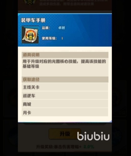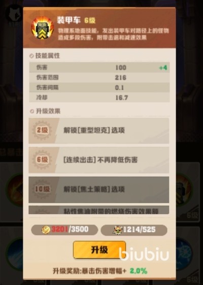 装甲车的词条包括“连续出击”、“军备强化”、“致残碾压”、“焦土策略”和“急速冲锋”,其中“连续出击”和“焦土策略”是优先级最高的升级项,如果大家有五星上将,更是能让装甲车进化为“重型坦克”,增强击退和伤害效果,最高可提升60%的伤害和击退效果。
