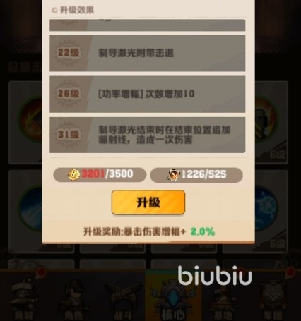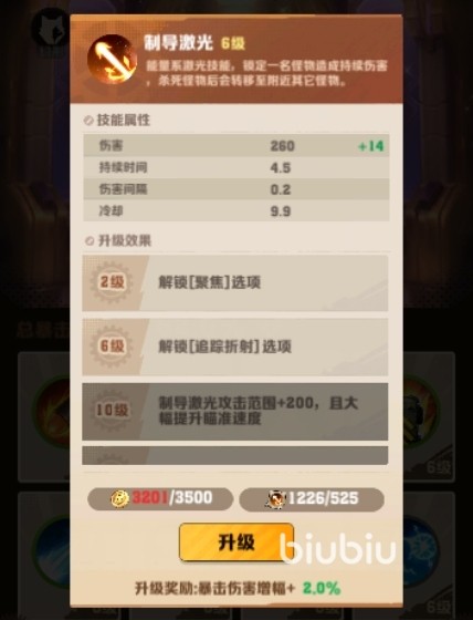 在升级方面,通过提升激光伤害,可以使它对主要目标造成额外200%的伤害,玩家也可去选择让激光击中敌人后爆炸,以此来扩大自身的攻击范围,从而增强群体伤害的能力。