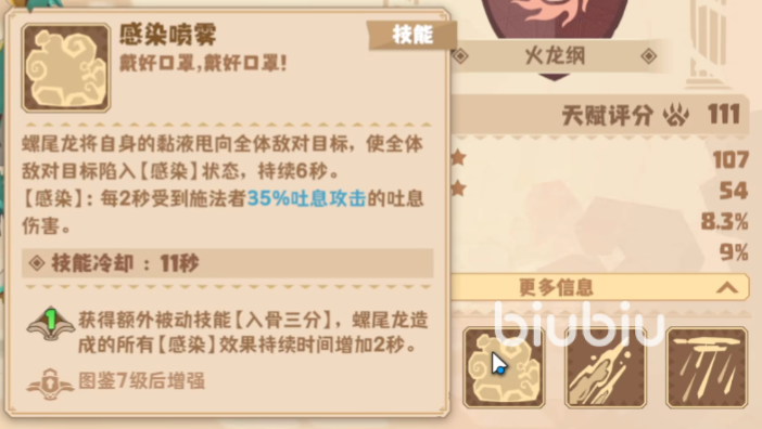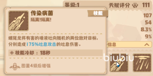 传染病菌是更加厉害的输出能力,它可以把有害的唾液喷吐到两位敌对目标身上,造成175%吐息攻击的伤害值。但是因为它的攻击目标有限还是随机的,实战当中就要能不能攻击到重要敌对目标了。
