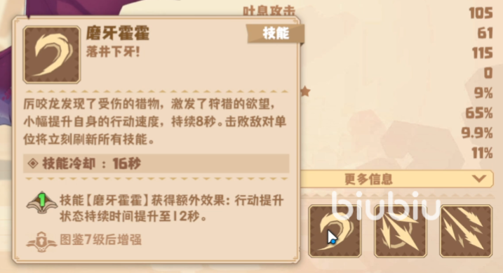 磨牙霍霍这个技能是有额外效果的,可以把行动提升状态持续的时间提高到12秒,这样在使用这个技能的时候,就可以长时间的获得移动速度加成的效果,并且要是击败敌方单位,还可以刷新全部技能。