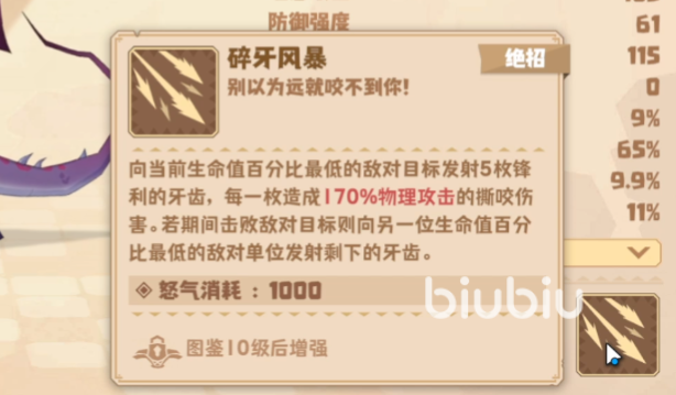 狩猎利齿是对普攻的强化,专门打生命值最低的敌人,发射3颗牙齿,每一个都是100%的物理伤害。大招就是碎牙风暴了,这次是强化到发射5颗牙齿,并且造成170%的物理撕咬伤害,要是击败了一名单位,剩下来的牙齿会找周围血最低的敌人进行攻击,实现精准打击。而且它所需要的怒气在同类大招当中并不算高,用起来性价比还是很高的。
