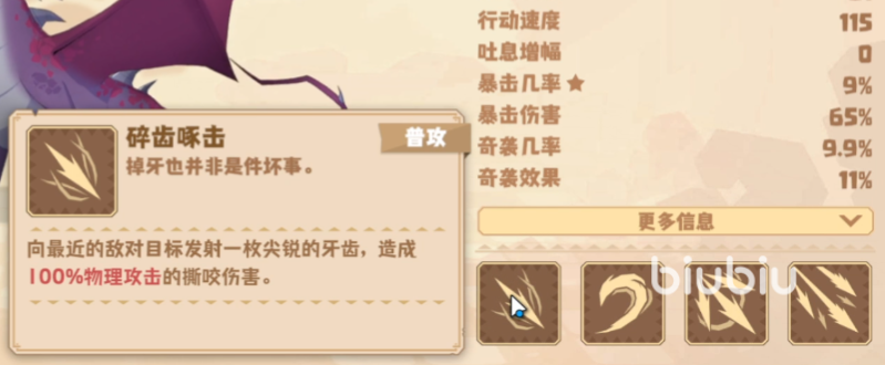 它是有一口尖利的牙齿的,战斗的时候会用碎齿啄击这个普攻技能,朝周围最近的敌对目标发射一枚牙齿,对其造成100%的撕咬伤害。